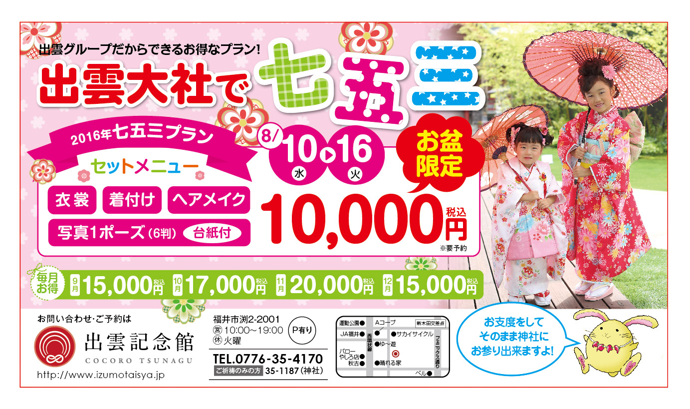 毎年恒例の七五三プラン8/3号のファミール様にて掲載されました。752-28/10~16の期間、お盆特別価格での提供となっておりますのでご予約、お待ちしております。