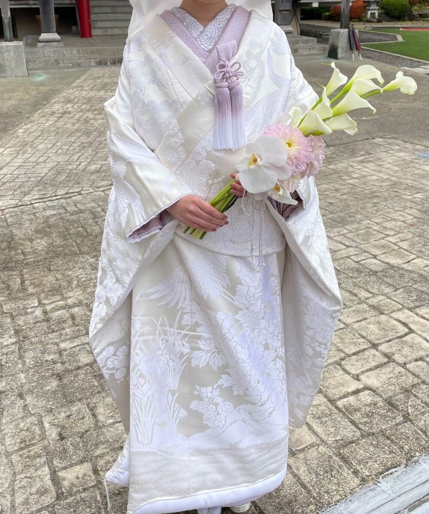 こちらの新婦様は掛下と呼ばれる白無垢の下に着るお着物が薄い紫で上品に仕上げており、さらに、ブーケもお色味を似た形にし、おしゃれ花嫁上級者の装いとなっています!