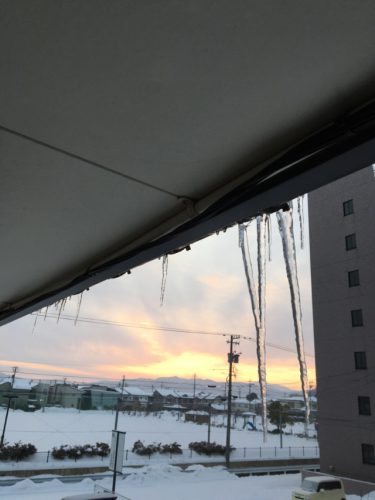 夜のうちにすっかり氷柱(つらら)が垂れてしまって、 私たちが動き出す、陽のさす頃には 朝日が氷にさんさんたる光を放っている、 という景でしょうか。