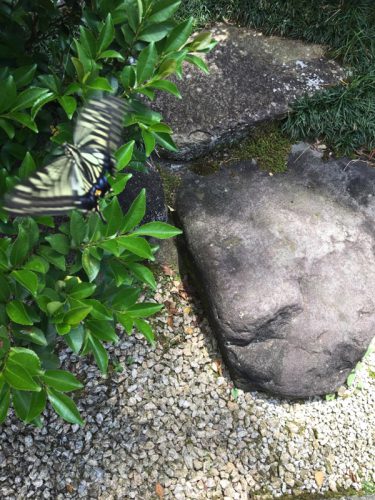 神社の庭園を掃除していると、どこからともなく大きなアゲハチョウが。